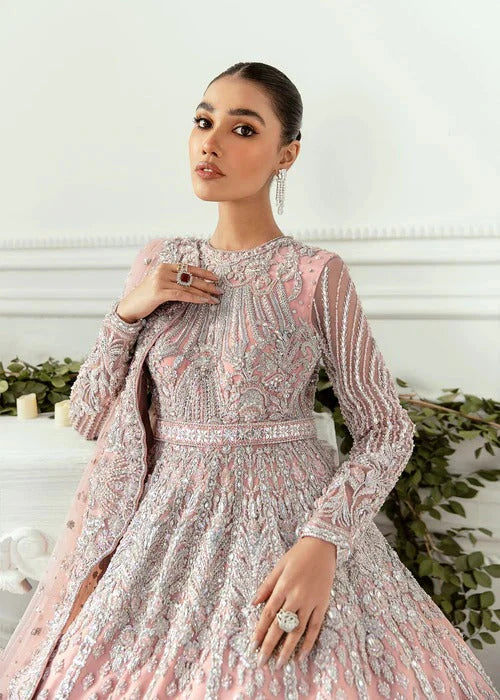 The dress features a luxurious and heavily embellished front-open gown design, rendered in soft pastel pink tones. Embroidery, sequins, pearls, crystals, and floral elements can be seen throughout the garment, making it a detailed and premium bridal ensemble. Light pink with hints of silver and nude net underlay, giving a soft yet regal bridal look. Full sleeved, floor length gown with a flared silhouette traditional yet contemporary.