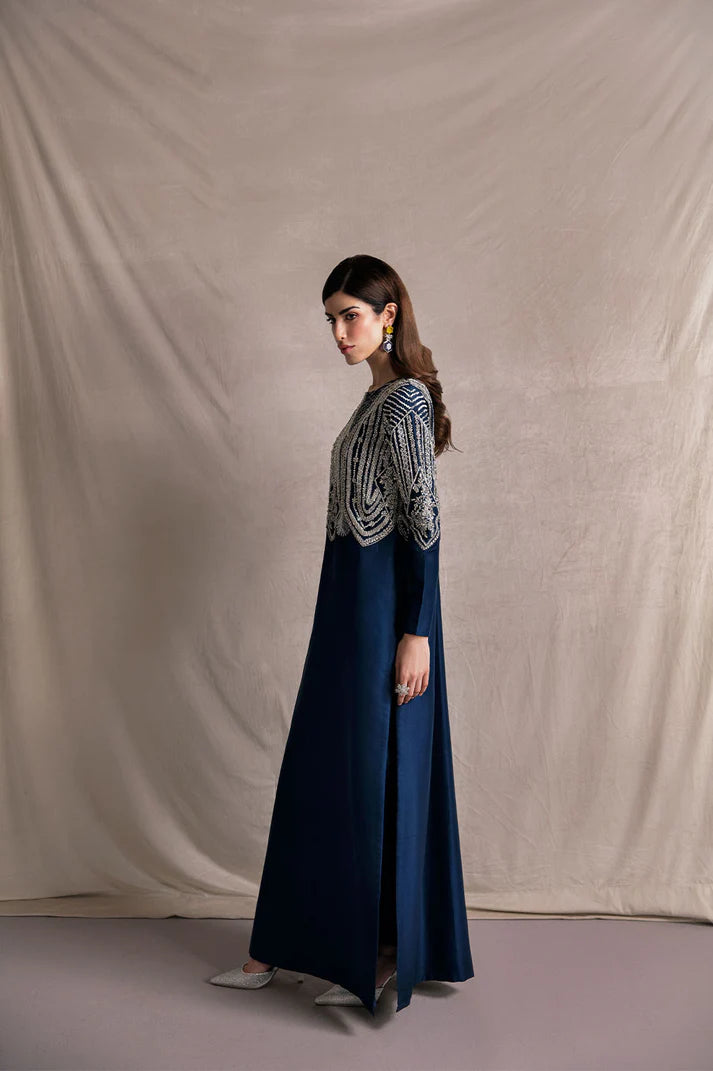 Description: Embrace the essence of your impeccable taste and unwavering sense of style in our navy blue ensemble. In the rich hue of navy blue, this outfit effortlessly captures the essence of refined allure. The floor-length straight shirt is tailored to perfection in the finest raw silk fabric and is meticulously adorned with silver hand embellishments on the bodice and sleeves, optimising timeless elegance and artistry. Harmoniously paired with silk cigarette pants, this creation is a masterpiece that transcends boundaries.