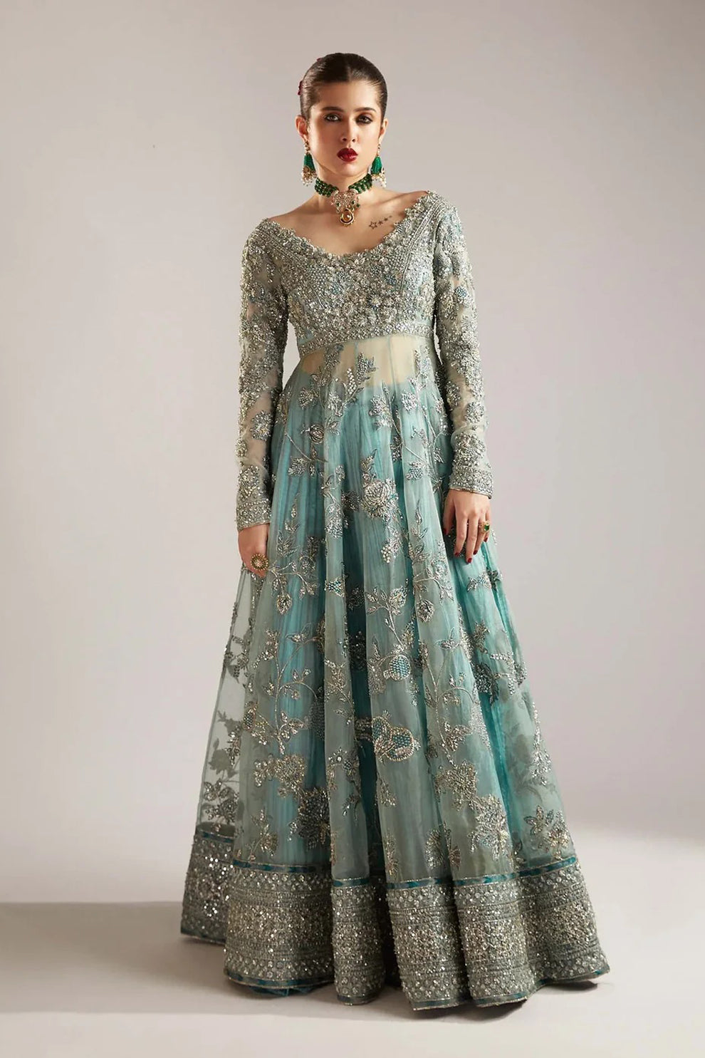 A dainty Ice-Blue silhouette, lavishly adorned with intricate embellishments on the front and back bodice, creates an alluring look. The opulent peshwas showcase heavy embellished borders, evoking a regal charm fit for royalty. Accompanying this divine piece is the resplendent silk crushed sharara, draping gracefully and exuding a fairy-tale like aura. Completing this enchanting ensemble is the digital printed dupatta, featuring celestial motifs in mesmerizing hues. Its four sided embellished border exudes an aura of ethereal elegance.