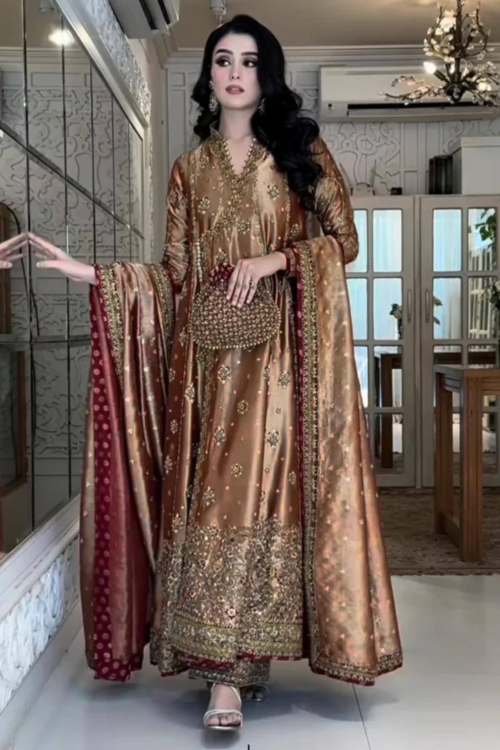 The ASWAD ensemble by Haris Shakeel is a majestic creation that exudes timeless regality. The outfit is crafted in a rich bronze-gold hue, adorned with meticulous hand-embellishments featuring intricate floral motifs, sequins, and more detailings that cascade gracefully across the front. The long silhouette is paired with a heavily worked hemline, enhancing its grandeur.