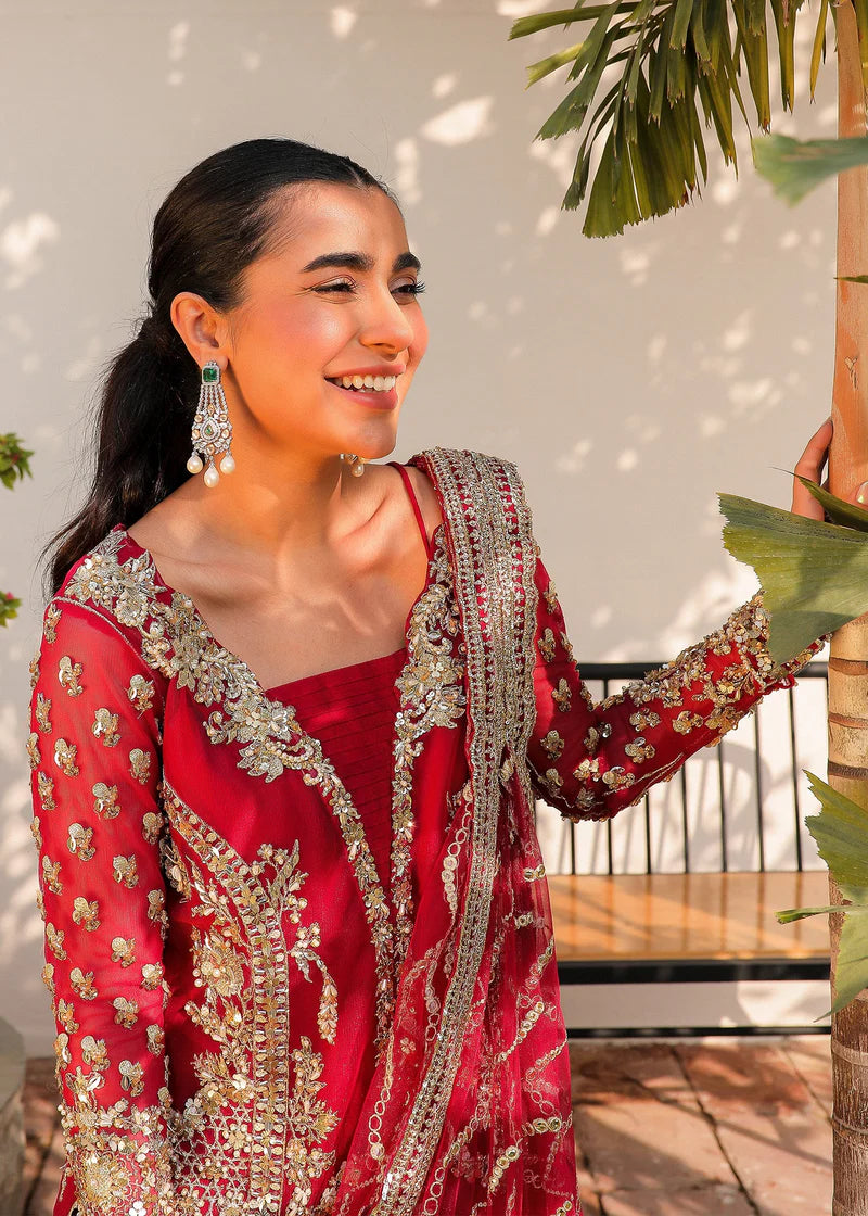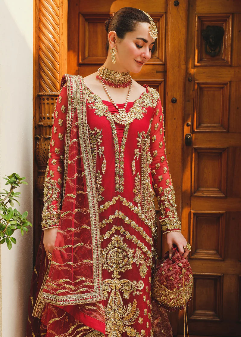 Presenting the ever so popular red! Meticulously embroidered tilla work to look like naqshi, the entire front is embellished in Gota patti, pearl and champagne crystals. The embroidery is a mix of beautiful floral borders and delicate jaalis. The dupp is adorned in Gota and pre stitched to be draped in any style. The Sharara is a beautiful vintage print with gold tilla booti scattered all over and finished with a tilla border. Make a show stopping entrance at any function!