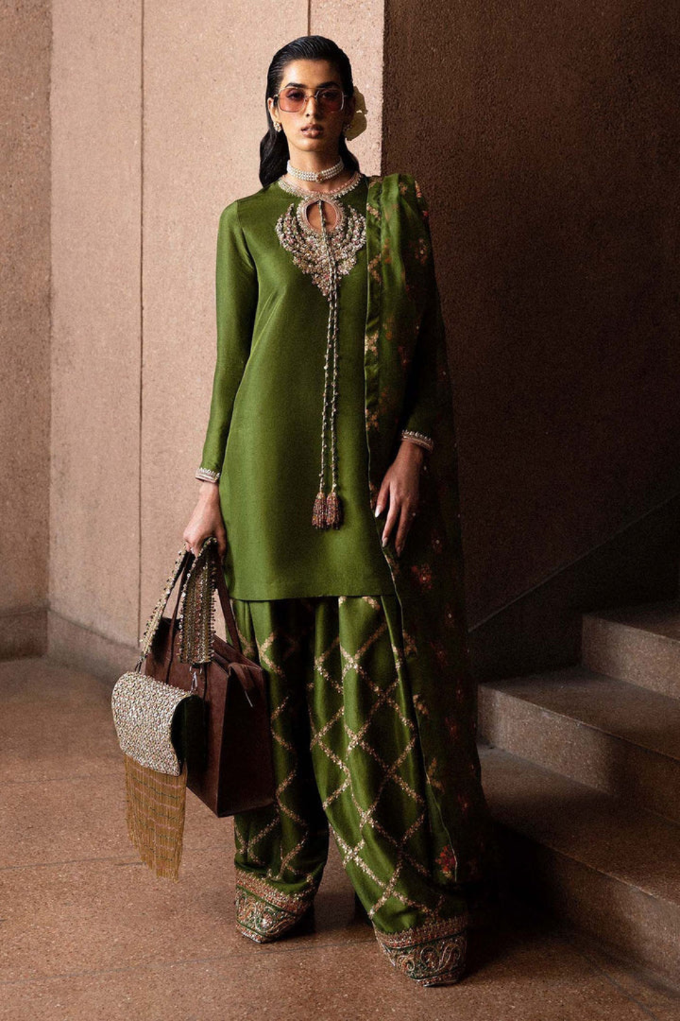 A regal olive green ensemble including a beautiful short raw silk shirt with embellishment detailing on neckline. The neckline is also adorned with gold sequins and naqshi with green, gold and pink buggle beads. It is paired with heavily embroidered and embellished shalwar. It comes with printed organza dupatta with block printed finishing on all four sides.