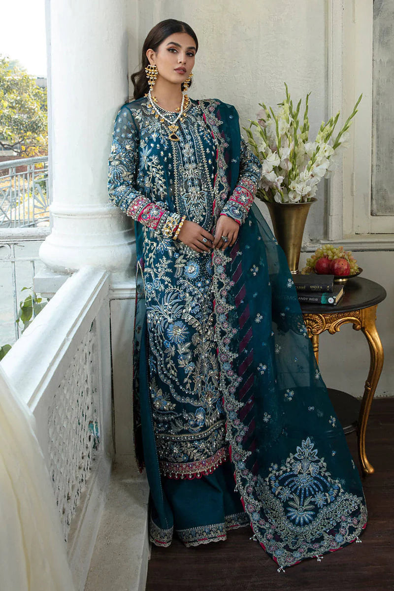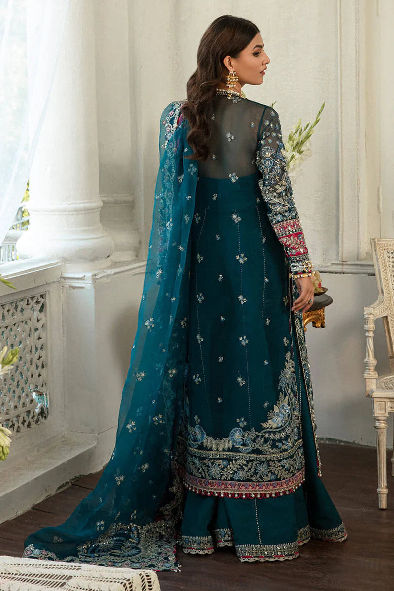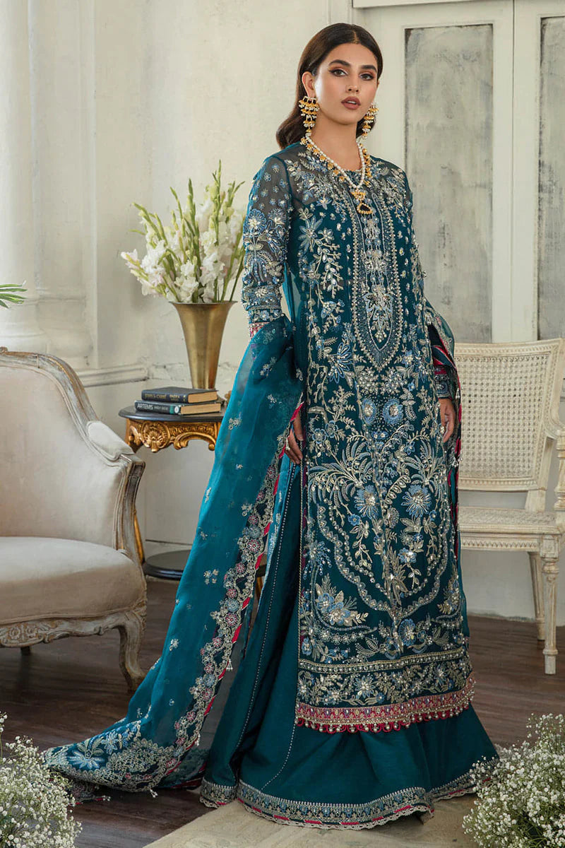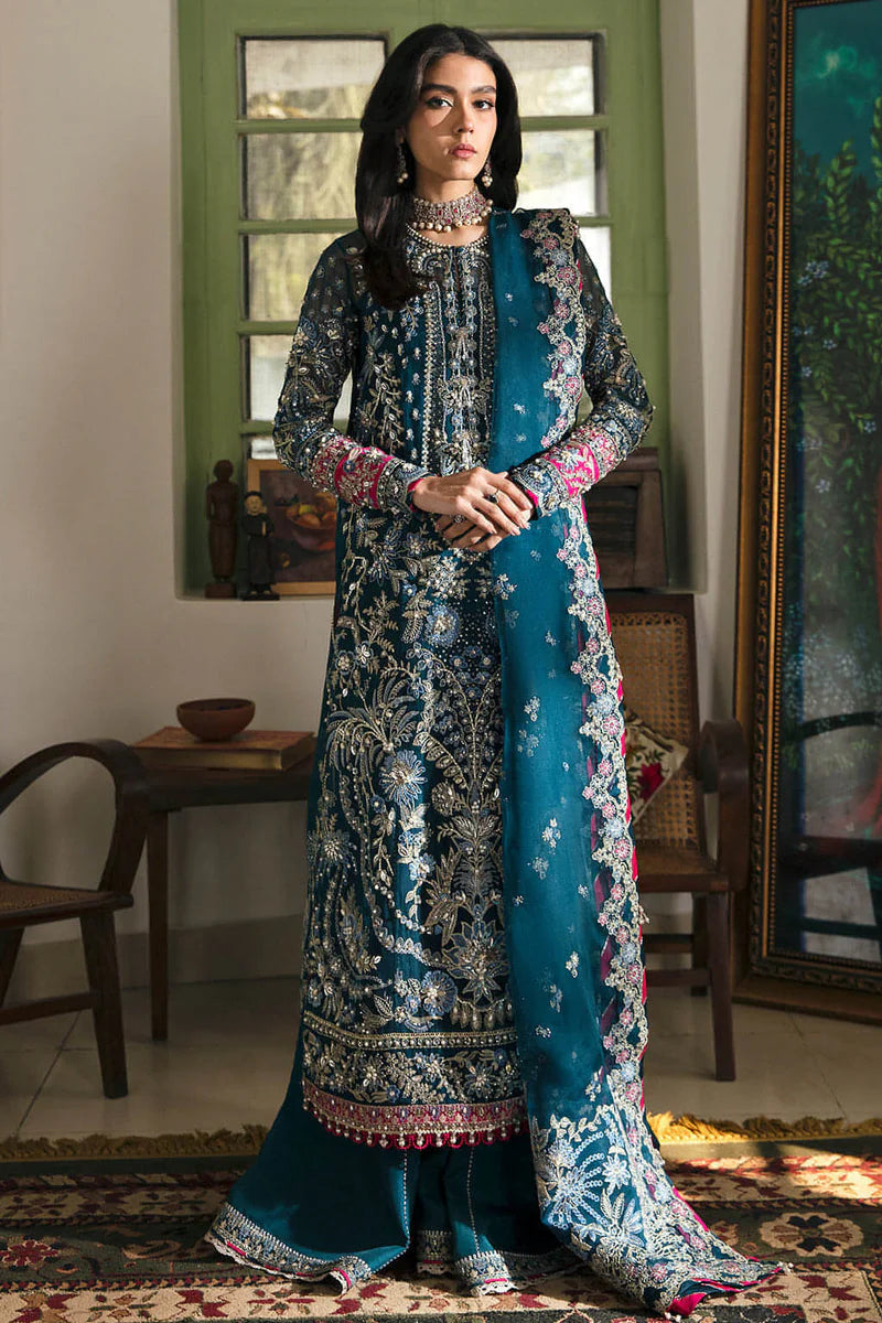 Diana is a gloriously curated silhouette serving festive fashion celestially with its appealing teal blue color and glinting adornments. An organza shirt and dupatta embedded with Fuschia pink hints and details of gota, crystals further fused with pearls and handwork details. Glistening silk pants are paired with it completing a quintessential festive look.