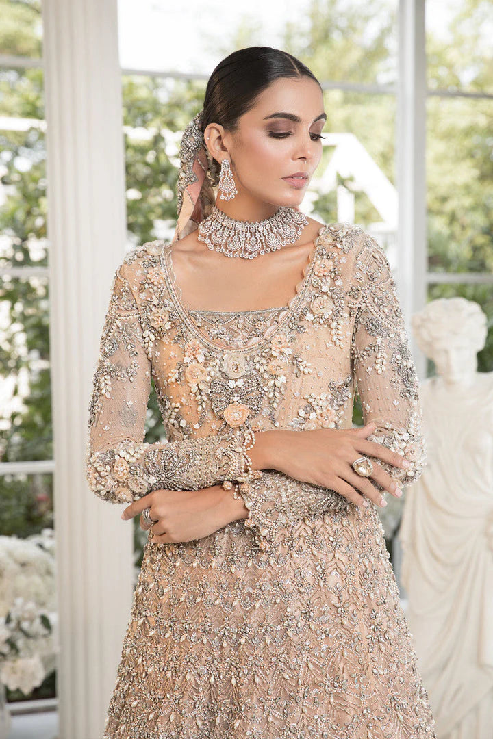 Our refreshing peach-hued signature 'AZALEA' lehenga is sure to make heads turn. Its beauty is heightened with our signature craft of 3D floral ribbon work embellished with scintillating diamantes, sequins, pearls, crystals, and dabka naqshi details. Completed by the skilled hands of our master artisans it is perfect for a graceful look.