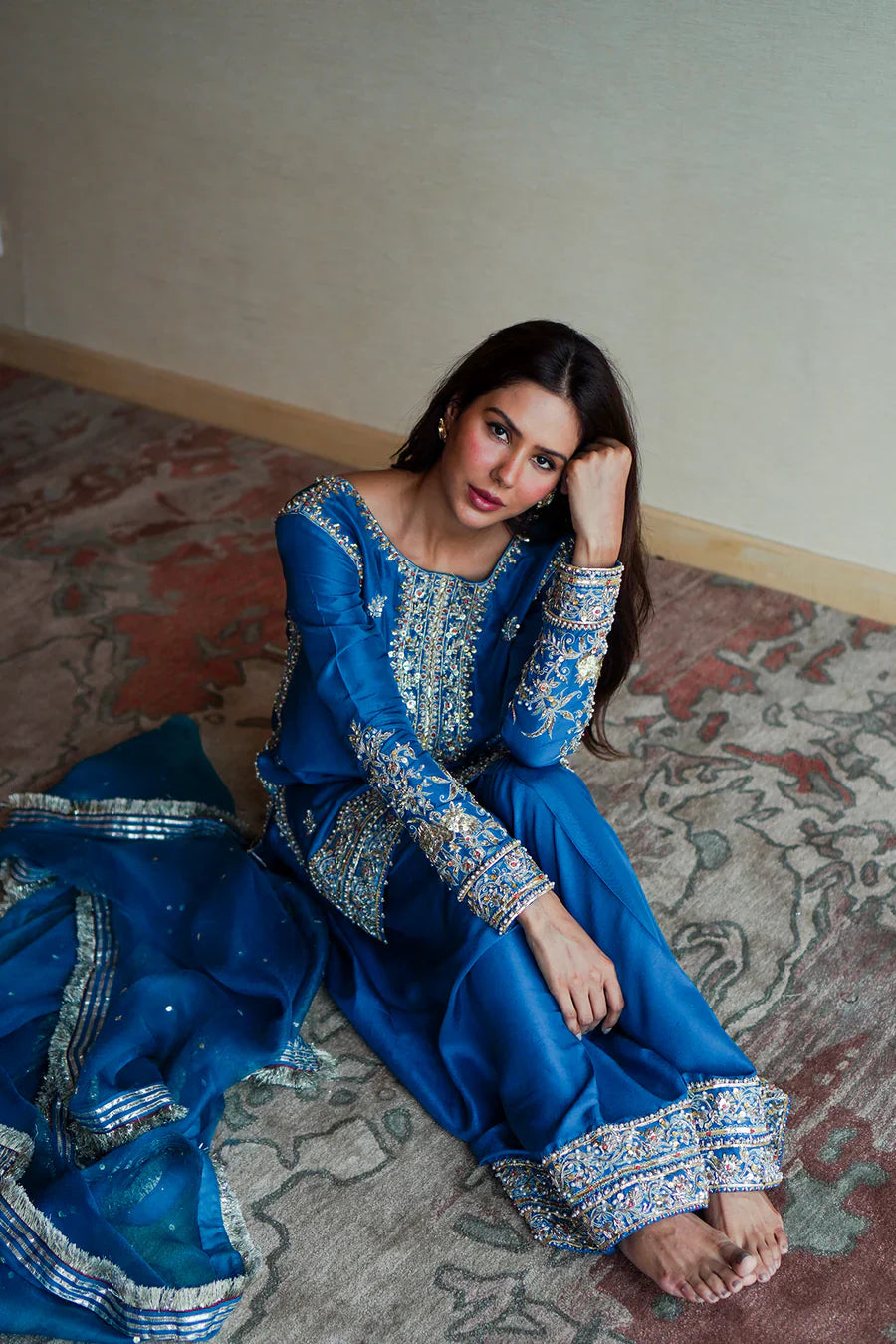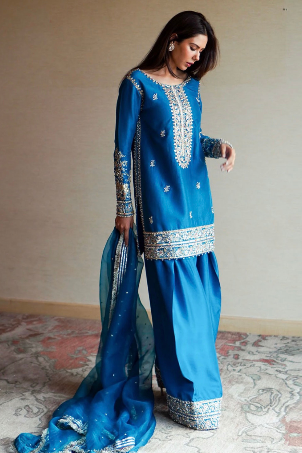 Heer features a gorgeously regal aqua-blue silk fabric cut perfectly into a short shirt embellished with intricate embroidery on the neckline and hem. It drapes beautifully over a stylish shalwar with a vogue cut and worked hem in silver accents. A sheer dupatta completes the outfit and enhances its charisma