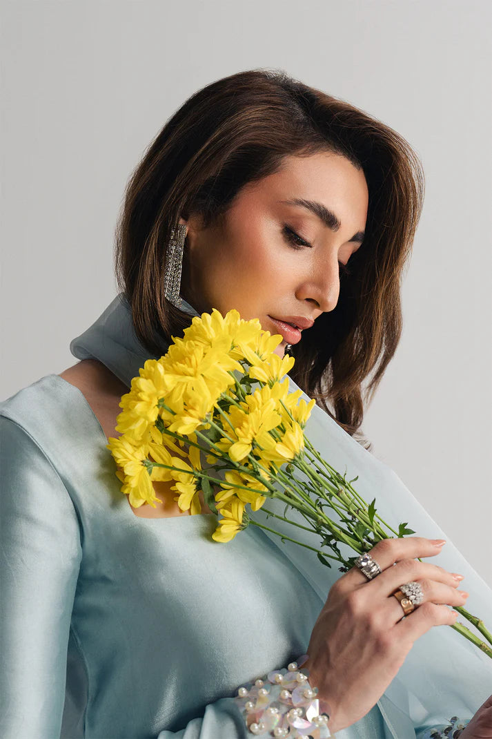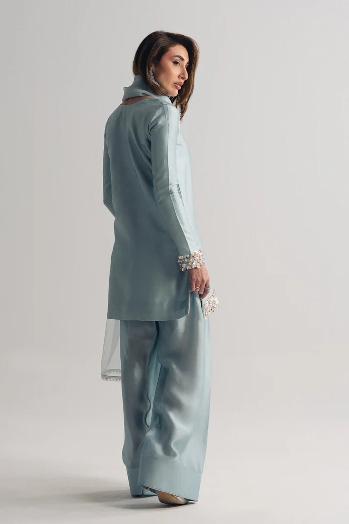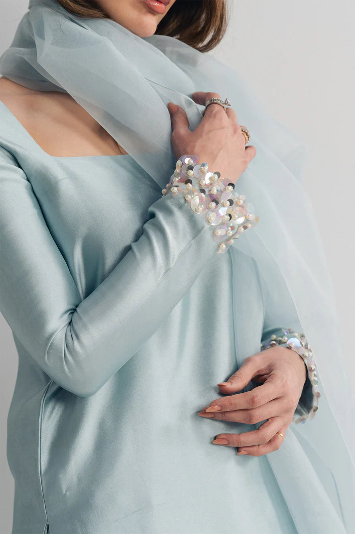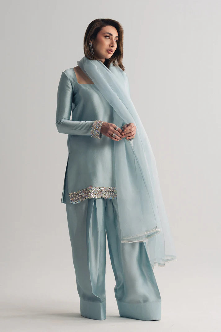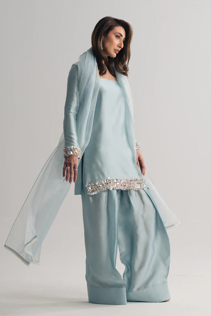 This graceful ice blue silhouette, crafted from luxurious Premium silk, exudes timeless sophistication. The shirt features a square neckline and is adorned with exquisite sequin hand embellishments along the front border and sleeves. The look is completed with a classic farshi shalwar and a delicate organza dupatta finished with lace detailing. This ensemble blends traditional charm with effortless elegance.