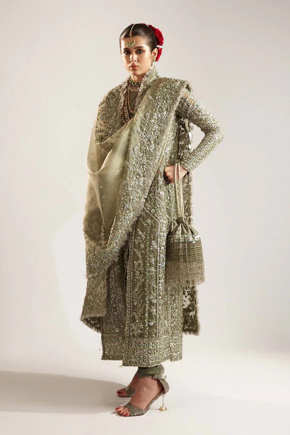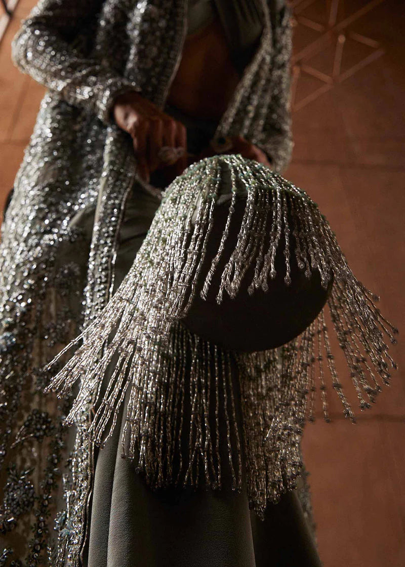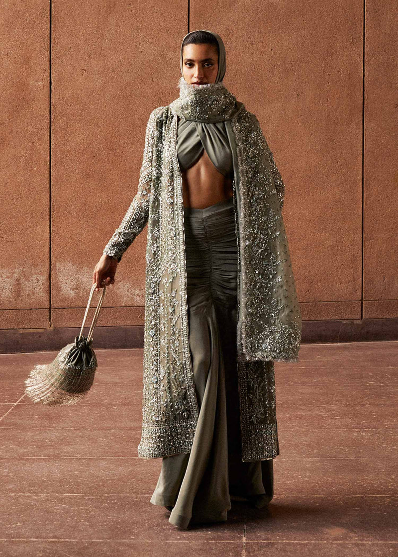 A classic dusty green organza jacket crafted with exceptionally intricate embellishment of handwork on sleeves and in panels, pairing with chooridar and with satin silk inner. To complete the grandeur look it comes with organza dupatta with heavily embellished scalloped borders on four sides with kiran finishes.