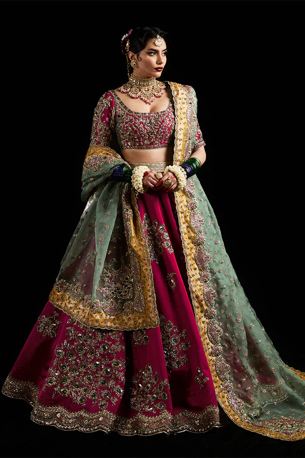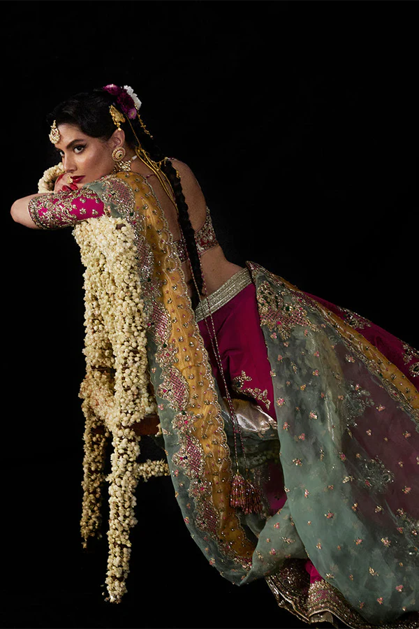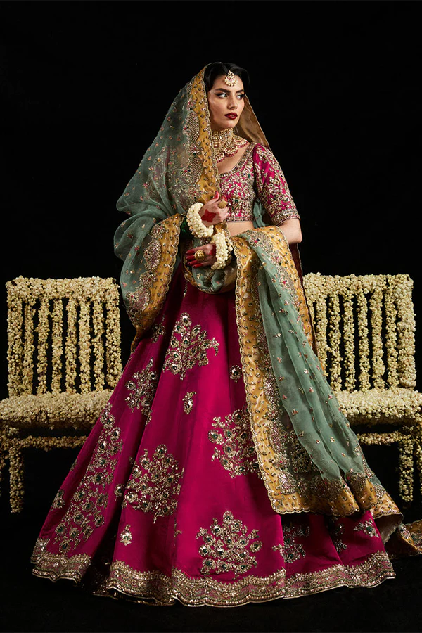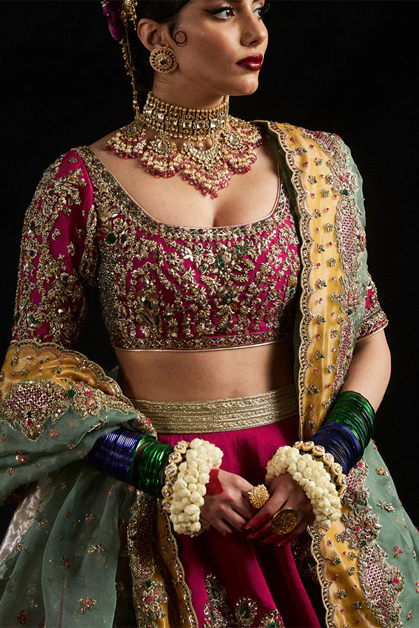 Make a statement with our stunning deep pink pure satin silk lenga, beautifully adorned with hand-embellished bunches and a crisp border. The fully embellished elbow-length blouse adds elegance, while the pure organza dupatta features playful pops of color that elevate the look. Perfect for any celebration, this ensemble seamlessly blends tradition with contemporary flair!