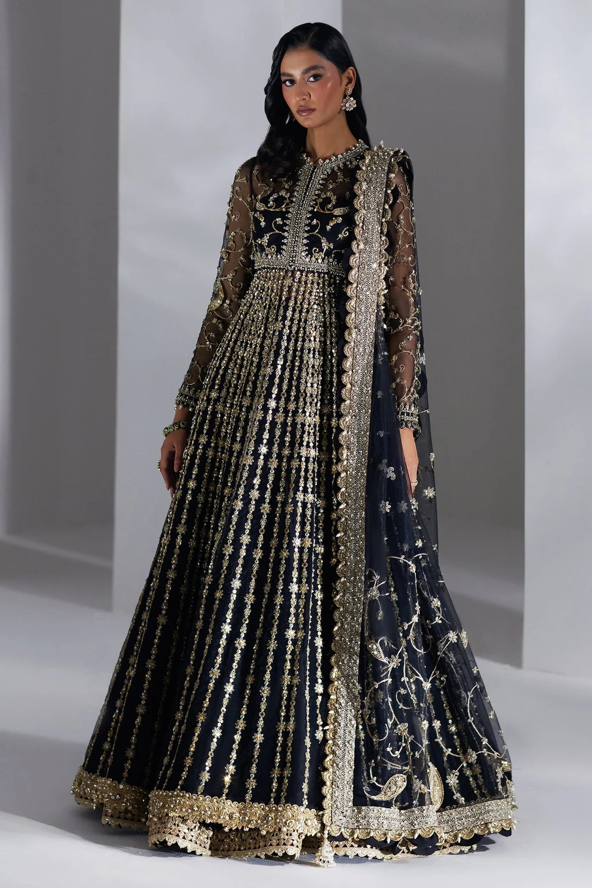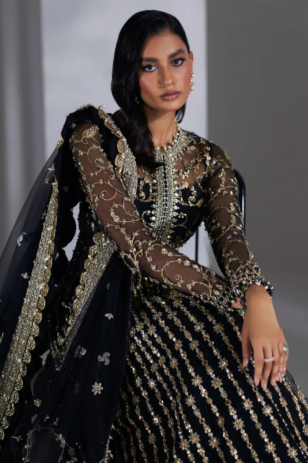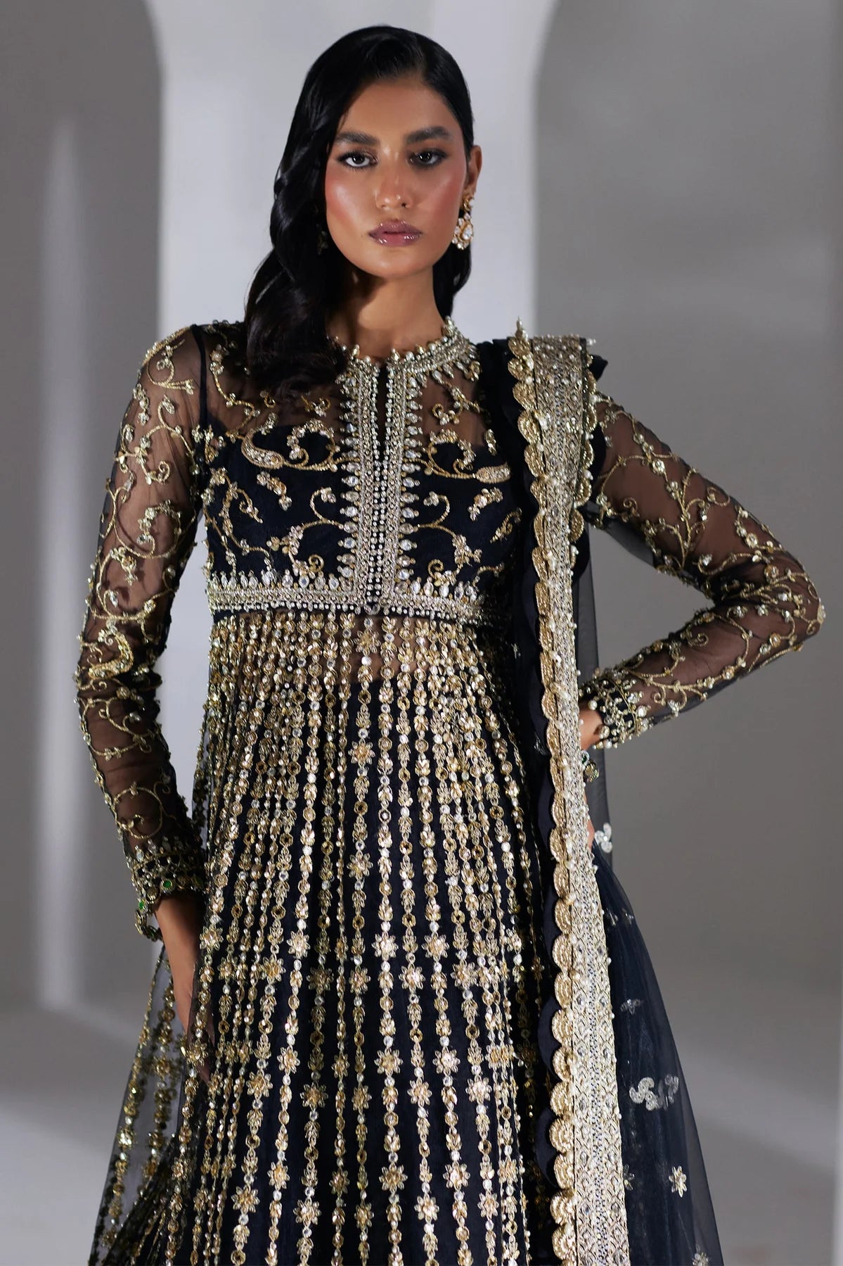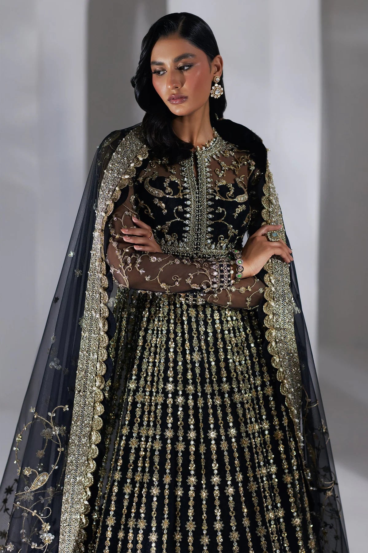 Introducing ‘Lueur Dorée,’ an extraordinary ensemble destined to command the spotlight with its opulent elegance. This luxurious masterpiece, crafted from a sumptuous obsidian canvas, is adorned with an exquisite array of sequins, crystals, GOTA, and ebony pearls, all accentuated with scintillating gold to create a striking and unforgettable statement. The intricate embellishments form patterns that resemble verses of gilded poetry, meticulously woven into the fabric. Paired with a diaphanous organza dupatta, framed by an exquisitely embellished border, this ensemble epitomizes the pinnacle of refined design and style. Ensuring the wedding festivity is transformed into a vision of sophistication and charm, ‘Lueur Dorée’ stands as the quintessential highlight of any celebration, embodying timeless luxury and unparalleled beauty