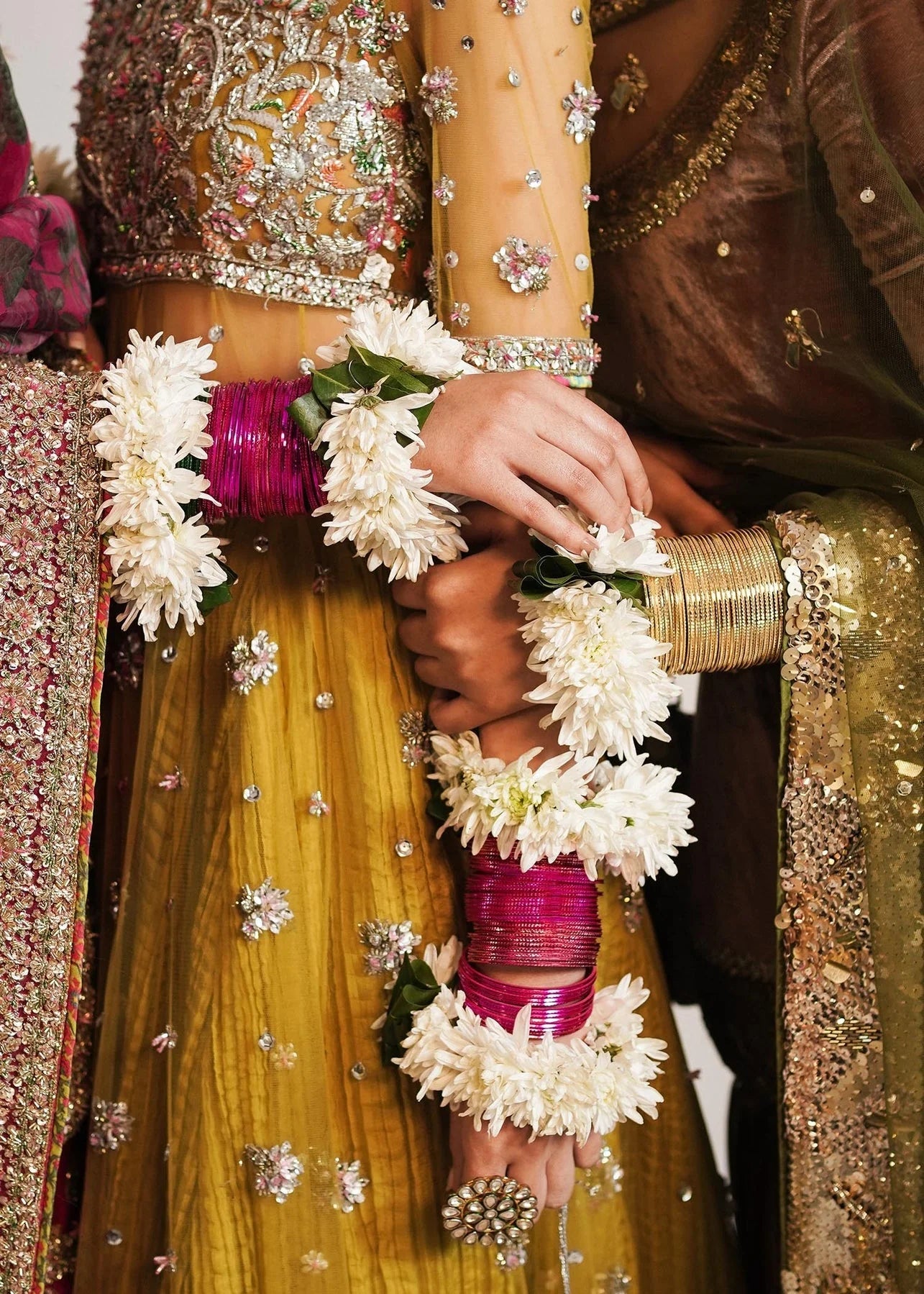 A spectacular lime yellow net peshawas with an embellished choker neck attached to intricately detailed front. The panels of peshwas are covered with beautiful chatta of small sequin bunches. The border of peshwas is made in a beautifully designed pattern which is also intricately detailed with adda work.