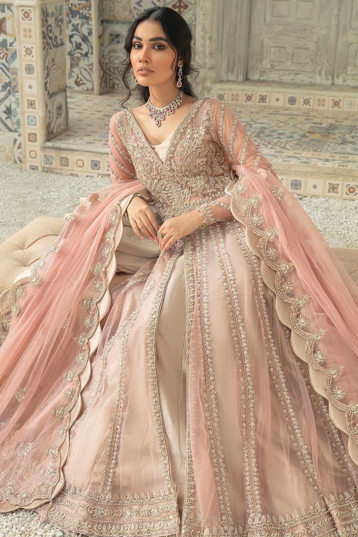 Work Technique: Embellished with dramatic merge of rose Gold and silver naqshi dabka are Handcrafted