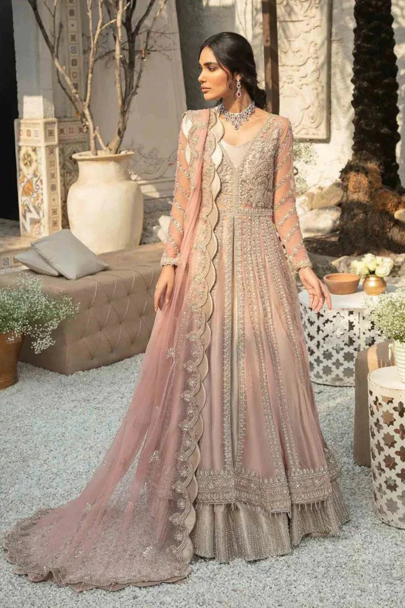 Toe Kiss length blush pink Net gown embellished with dramatic merge of rose Gold and silver naqshi dabka floral pattern has no shortage of intricate hand work details. Oxidized rose Gold tone tissue lehenga crafted by highly skilled technique along four-sided hand embellished scalped running boarder on net dupatta complete the silhouette.
