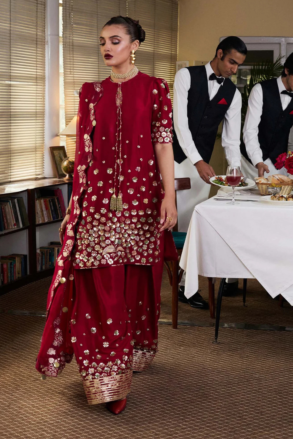 Make a statement of elegance and grace with this stunning hot pink ensemble, meticulously crafted to capture hearts. The outfit features a pure raw silk short shirt, radiating sophistication with its soft sheen and luxurious feel. Adorned with intricate golden hand embellishments of mukesh and dabka, the shirt exudes timeless beauty, elevating your presence with every movement. Paired with a perfectly tailored raw silk shalwar, chanderi silk delicate border adds a touch of finesse and refinement. The pièce de résistance is the organza dupatta, draped to perfection, spray-painted with hand-embellished flowers that flutter in a soft, floral cascade. Every detail of this ensemble is designed to turn heads, ensuring you stand out in the most enchanting way. Ideal for a special occasion or evening affair, this outfit is a blend of tradition and contemporary artistry, crafted to make you feel nothing short of royal.