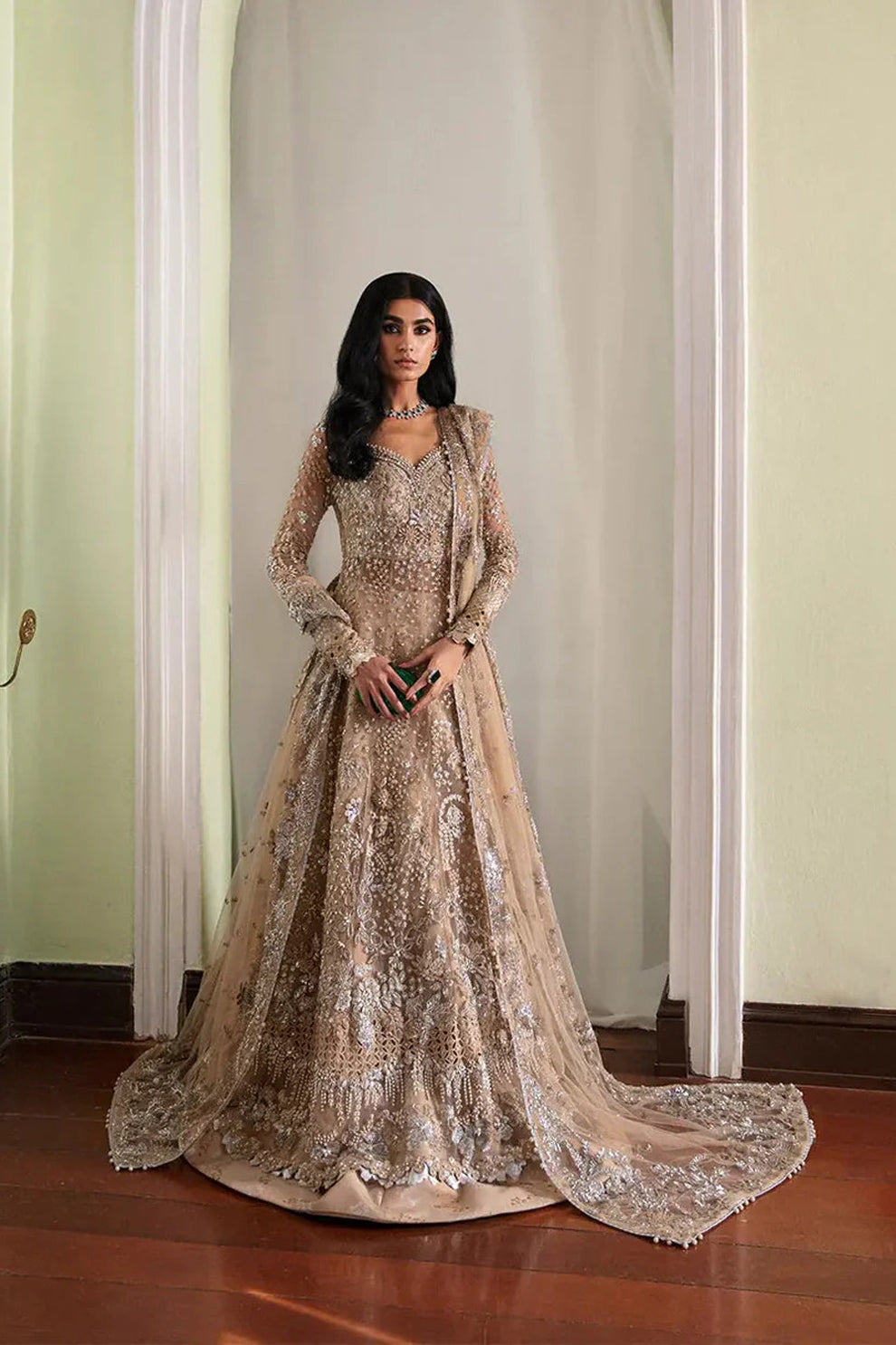 'Dazzle in reine’s golden splendor with its paneled frock, where Persian garden-inspired motifs bloom across silk with double-colored foil print. The sweetheart neckline opens to a canvas of exquisite hand-embellishments, zardosi, mukaish, crystals, and pearls, telling tales of opulence. The hem border radiates with silver handwork creepers and precise laser detailing, while the sequined four-sided dupatta captures light with every movement, framed by silver lace and delicate pearl handwork.