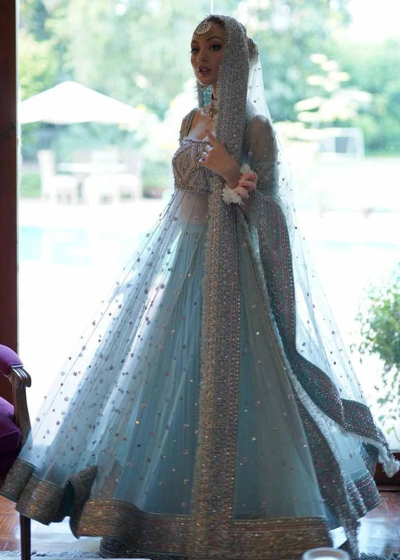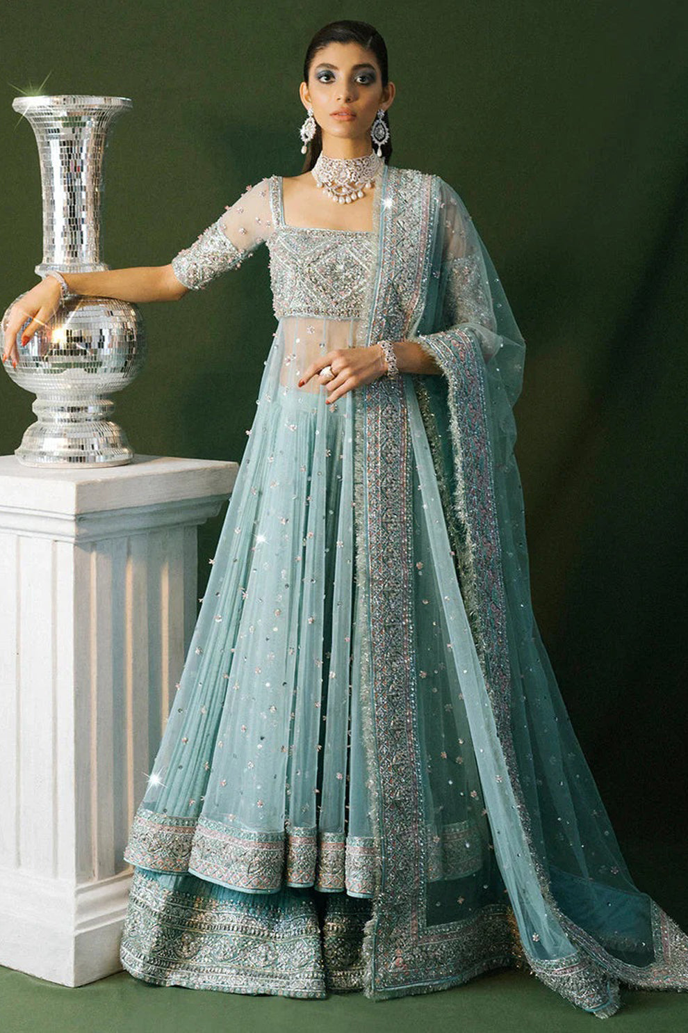 This ice blue net pishwas is gorgeously emberoided in hues of pinks and blues along with silver tilla. Adorned with pink and silver pipe work, mukesh, dabka, naqshi and stones.Completing the look with crushed silk sharara with heavy borders along with net dupatta featuring thick embellished four sided borders.