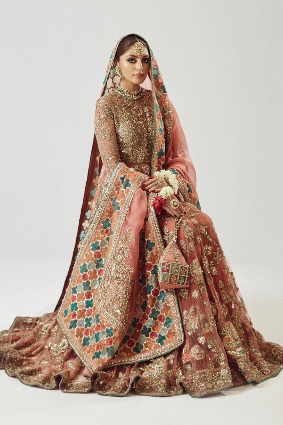 A spectacular rose gold net peshwas. The exquisite reham embroidery, enhanced with intricate adda work, elevates this ensemble to new heights of elegance. The medium silk crushed sharara, adorned with organza chatapati borders, exudes a sense of regal sophistication. And the organza dupatta, adorned with mesmerizing adda work, and organza chatapatti four sided borders adding a touch of ethereal beauty.