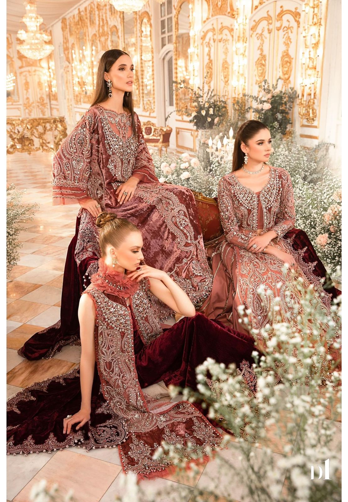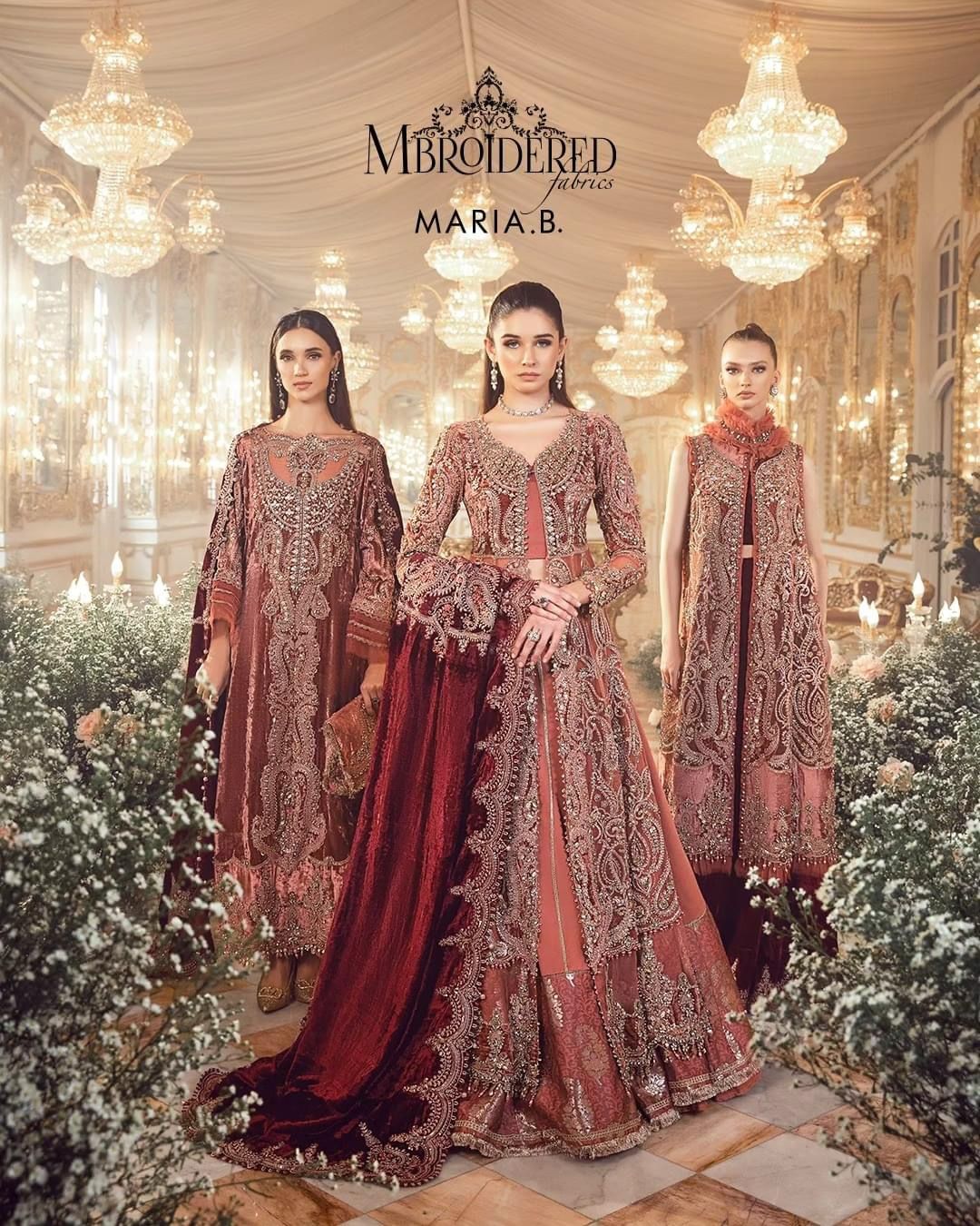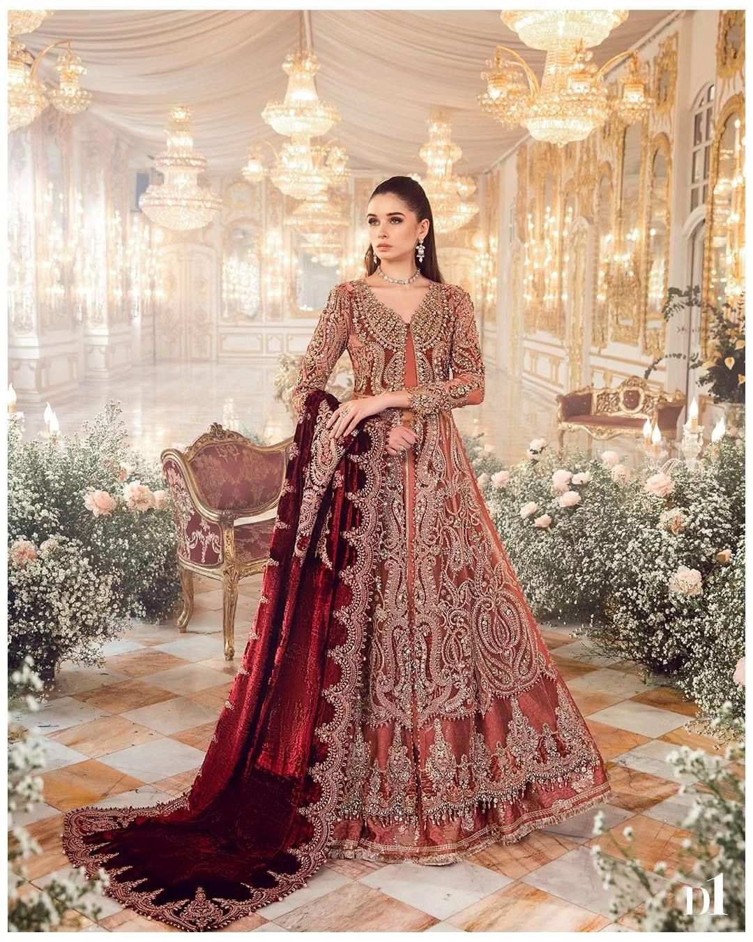 Step into the wedding affair with our salmon pink organza-jamawar four-piece embroidered ensemble hand embellished with intricate applique work and paired with velvet shawl.