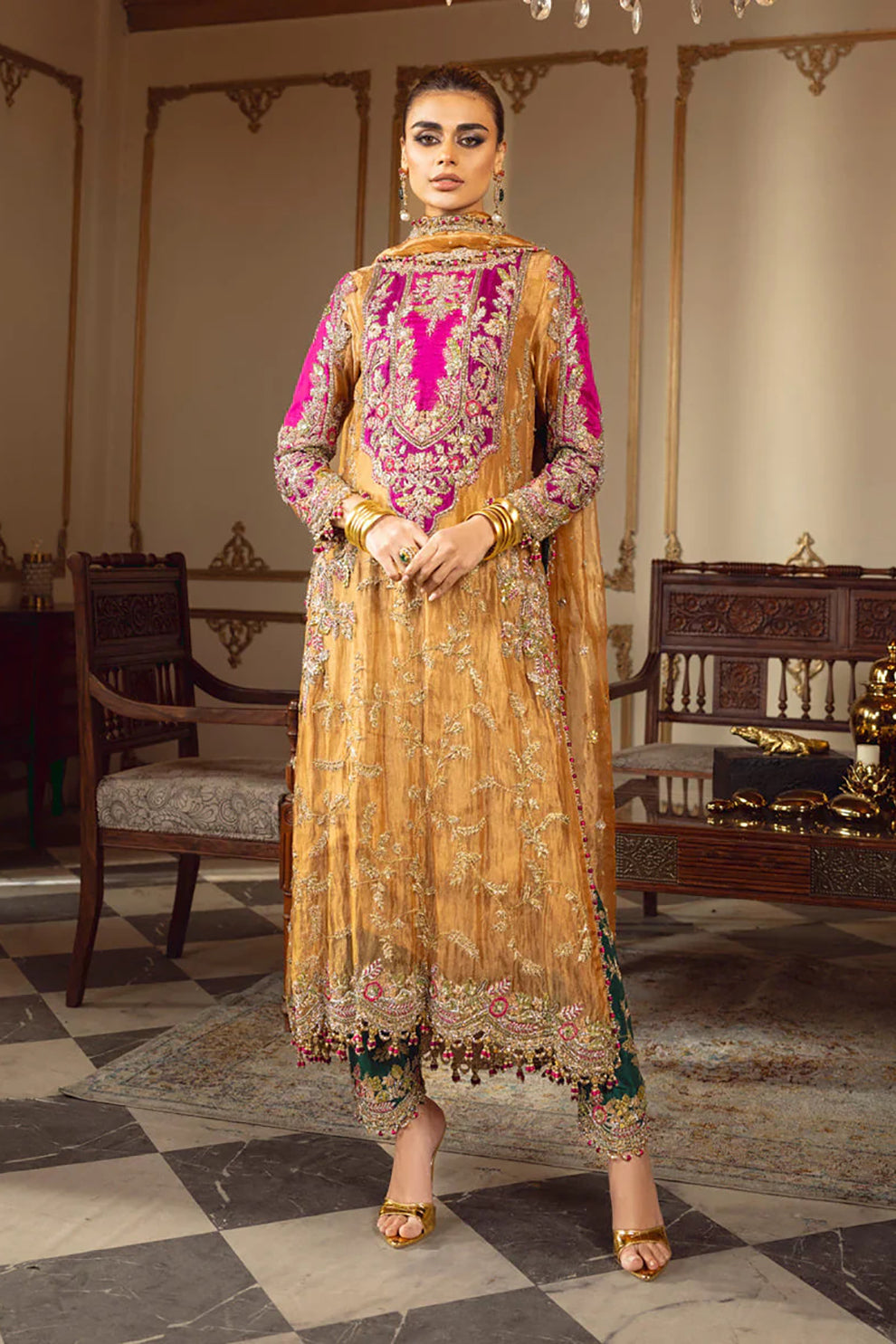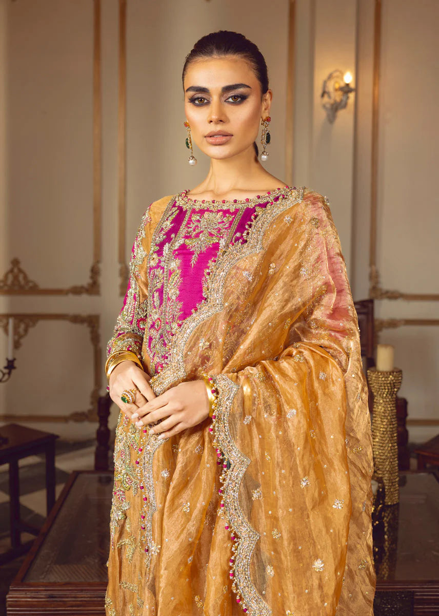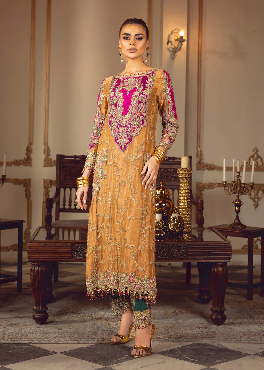 n the dimly lit room, SULTANIQUE emerges like a spectral bloom created with pure tissue in pale tangerine tone adorned with ethereal floral motifs paying homage to tales of ancient traditions. The ensemble celebrates old school elegance with each taanka laden carefully on the eclectic appliques creating a myriad of colors amalgamating convention with modernity. The turquoise green raw silk pants break the monotone of color and fabric exuding festivity and a mood of color and happiness.