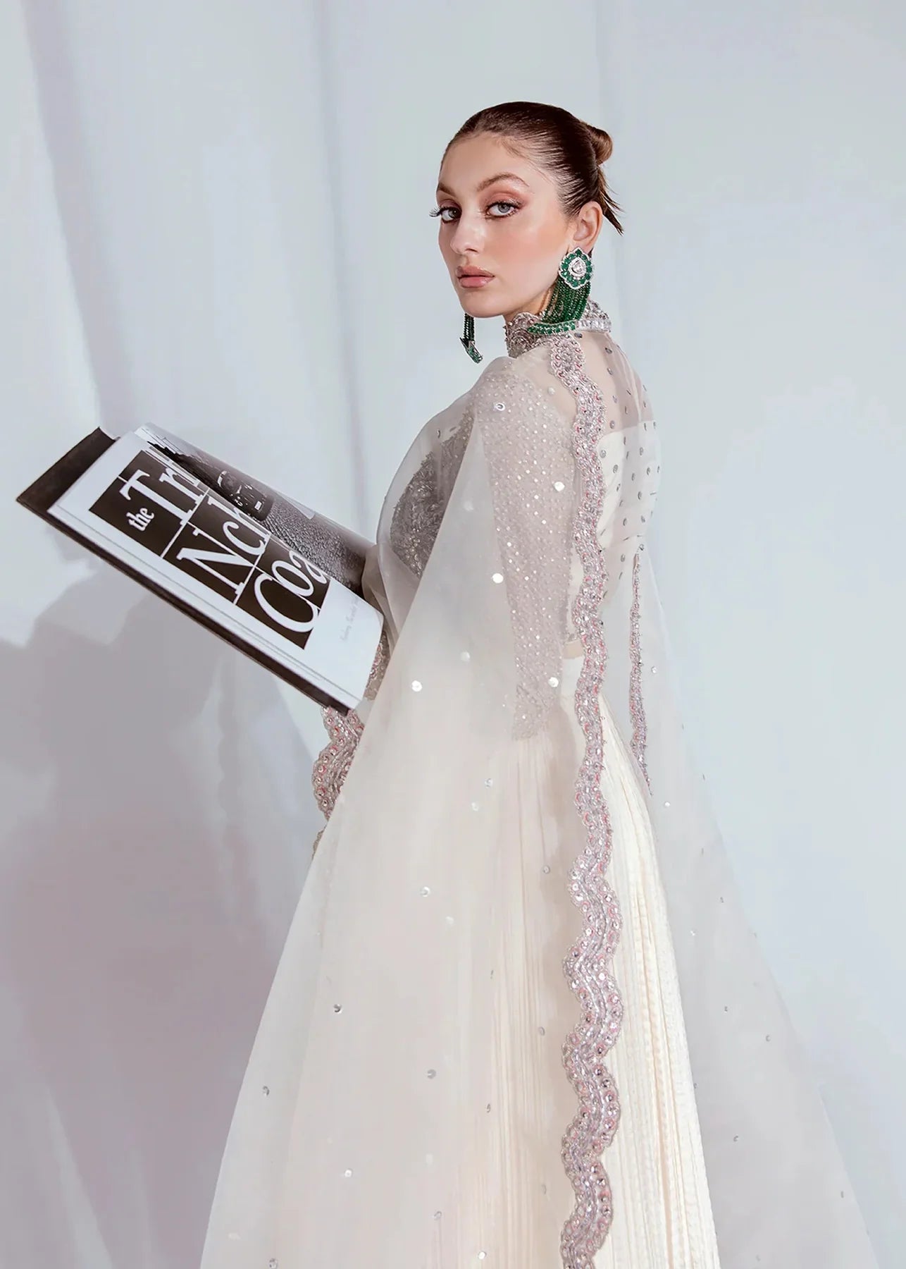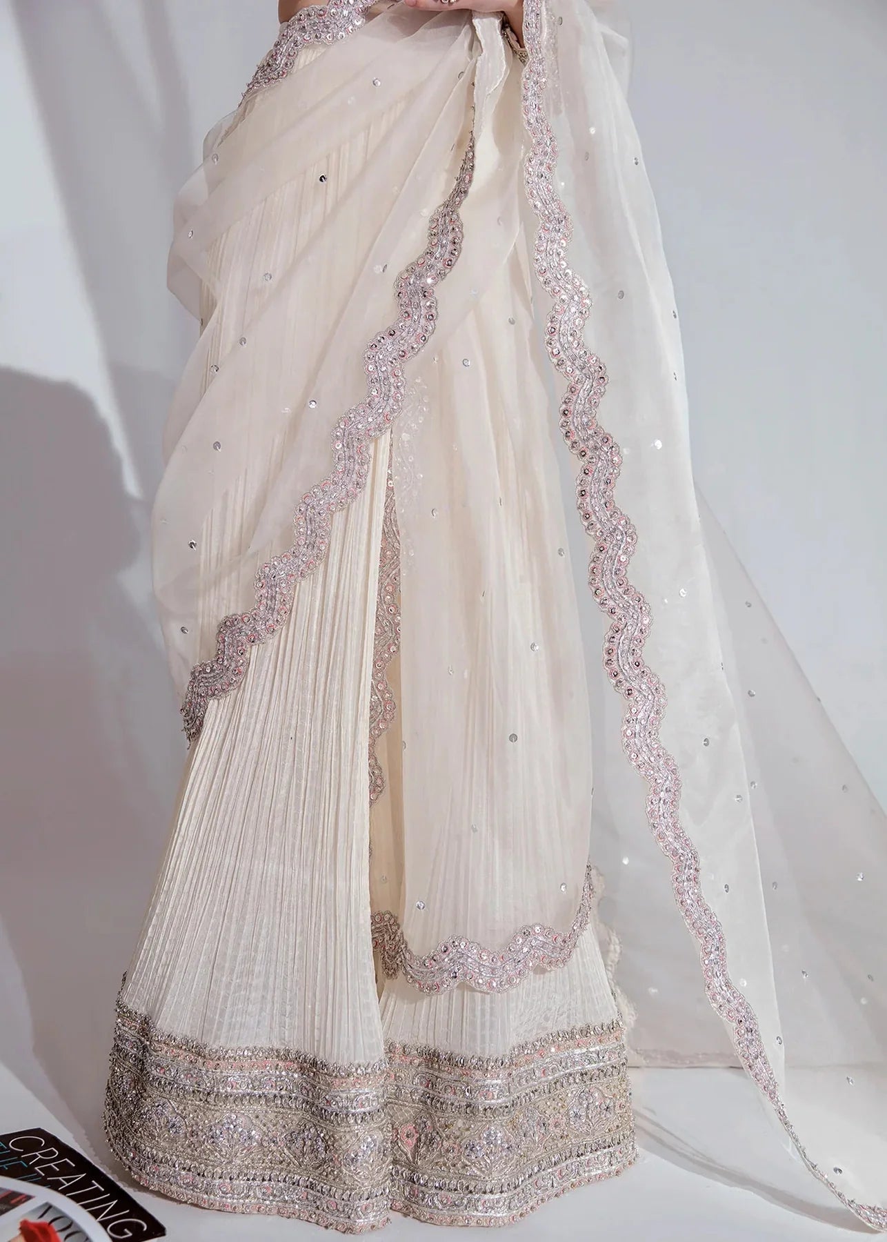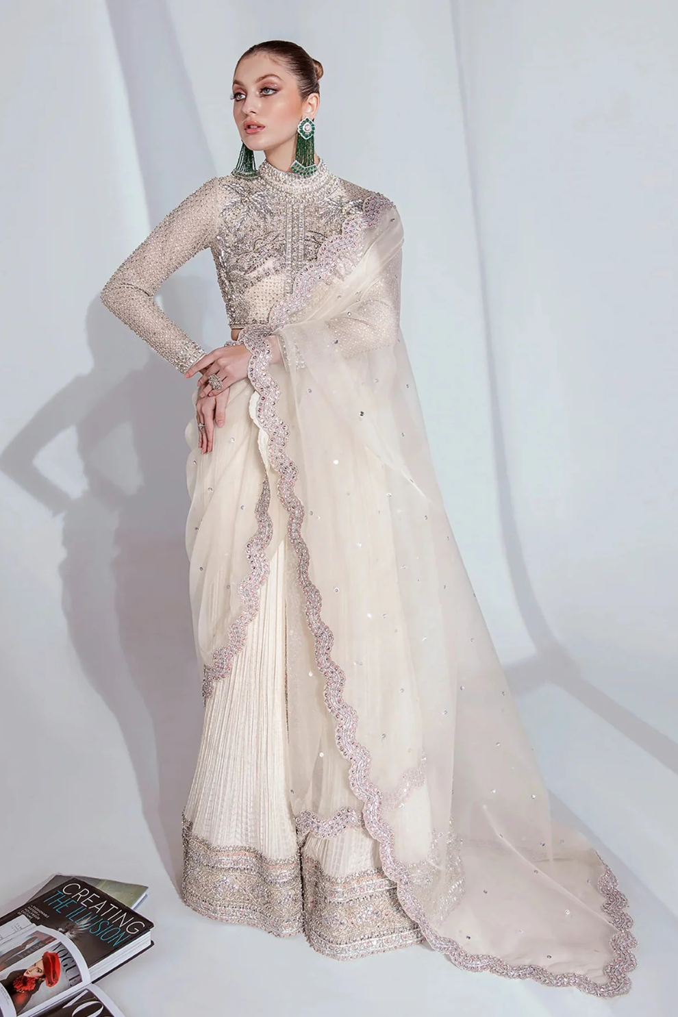 This set comes with an organza choli delicately embellished with silver sequins, pipe, and Swarovski, incorporating patent Hussain Rehar’s palm tree motif along with ban neckline. Crush sharara with heavy embellished border in silver and hints of pink.