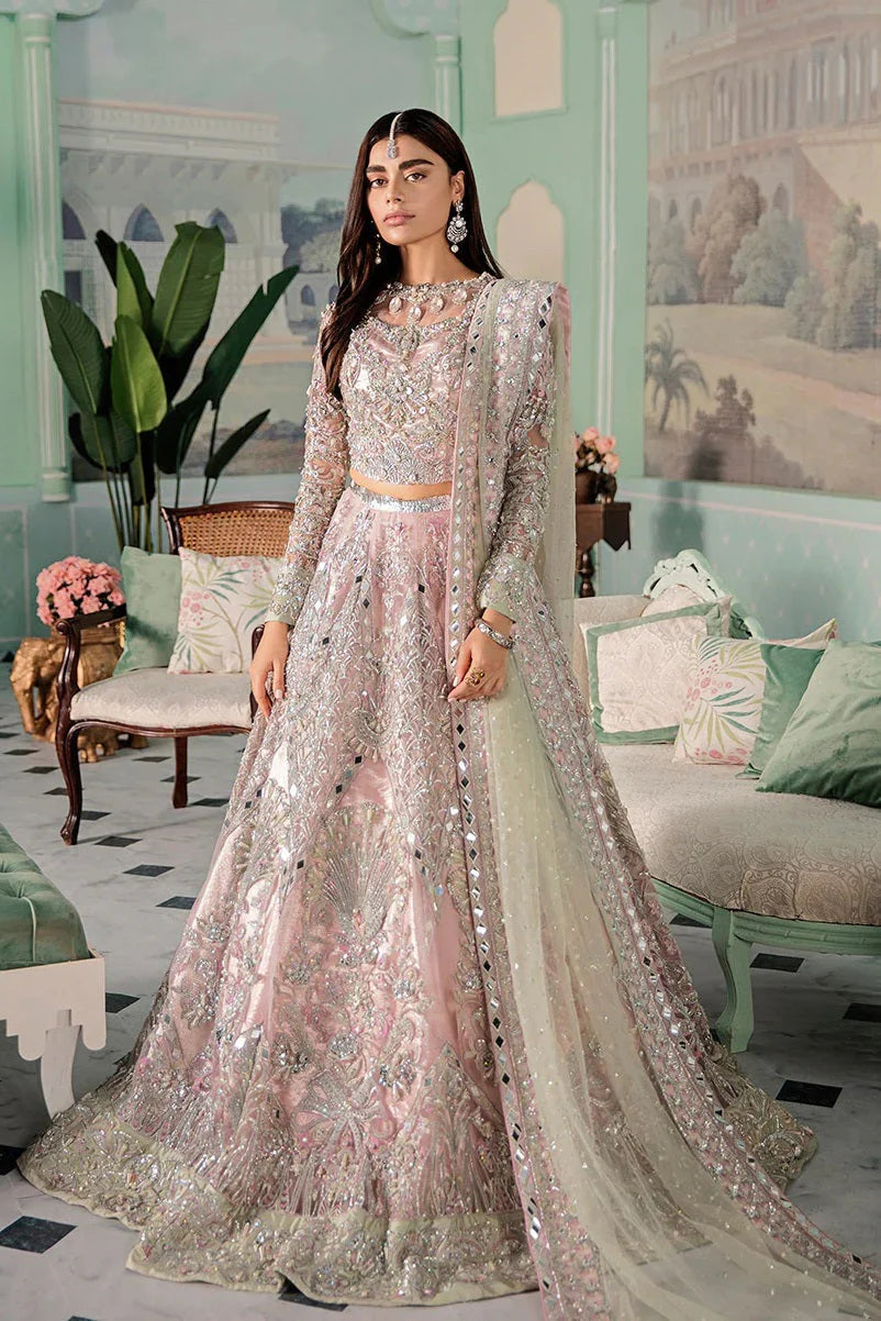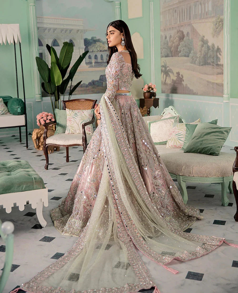 This majestic Lehnga Choli is beautifully crafted with dabka, nakshi, kora, swarovski, crystals, pearls, mukesh, sheesha and various other embellishments. Fabric used is tulle and tissue in enchanting pinks and muted mint green!